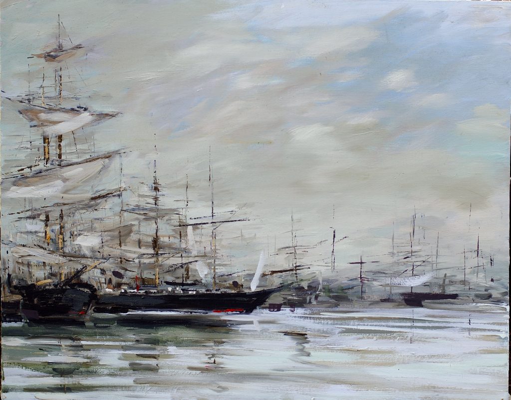 Le vent, l'eau, la lumière, les bateaux, les voiles, font partie de sa recherche pour recréer une ambiance, un univers, auquel il nous invite.